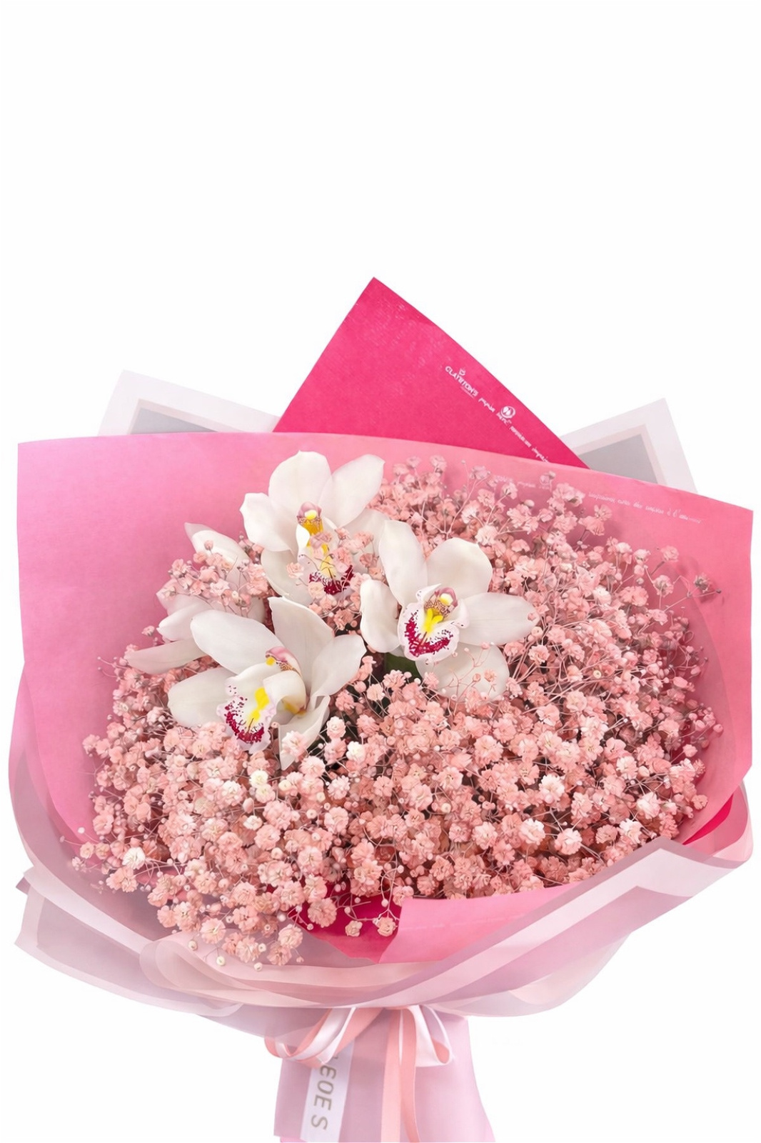 A charming bouquet of pink gypsophila with elegant white orchids, beautifully wrapped in soft pink paper. A romantic and delicate arrangement perfect for birthdays, anniversaries, or special occasions.